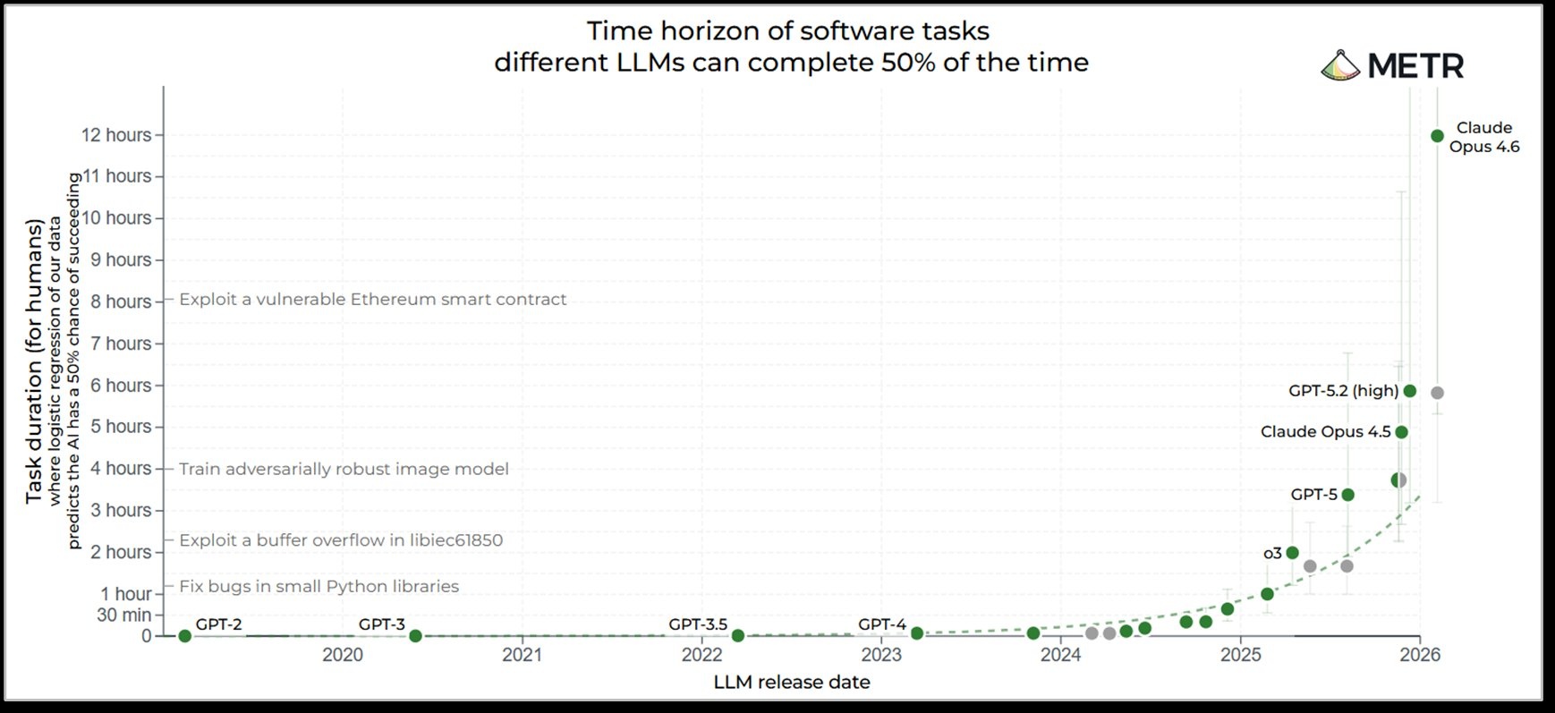 Figure 1. The growing task horizon of AI models. The y-axis shows the time a human expert would need for the same task; the x-axis shows LLM release date. The steep rise from 2024 onward is clear. Source: metr.org/time-horizons
