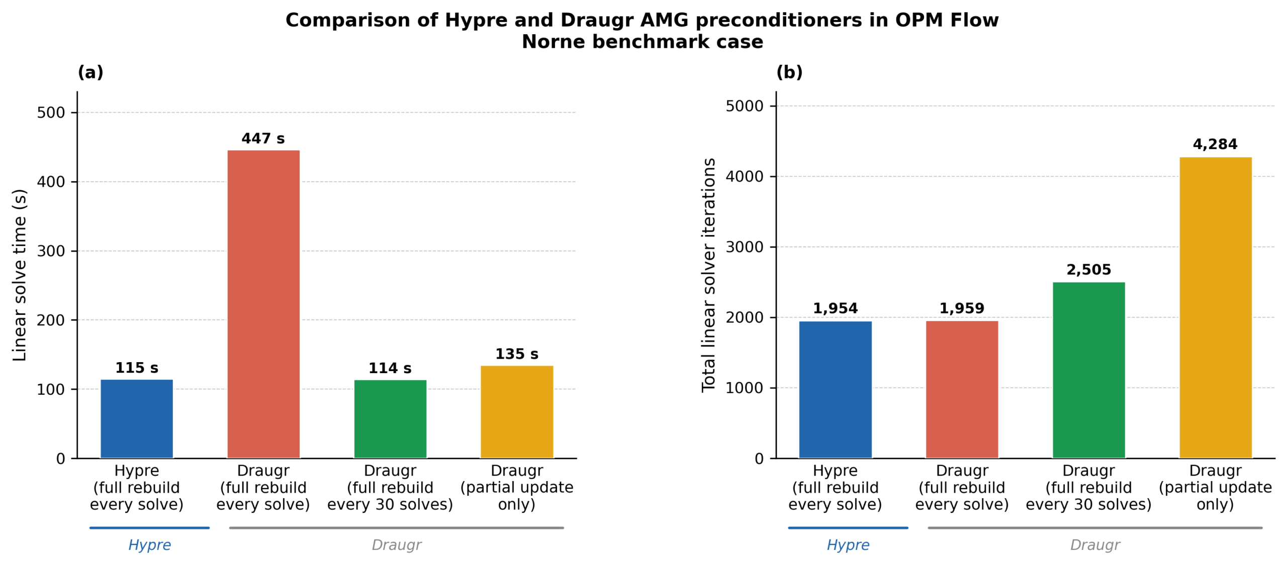Figure 8. Comparison of the hypre and Draugr AMG preconditioners running in OPM Flow on the Norne benchmark case. (a) Linear solver wall-clock time and (b) total linear solver iterations. Draugr with a full hierarchy rebuild every 30 solves matches hypre in both