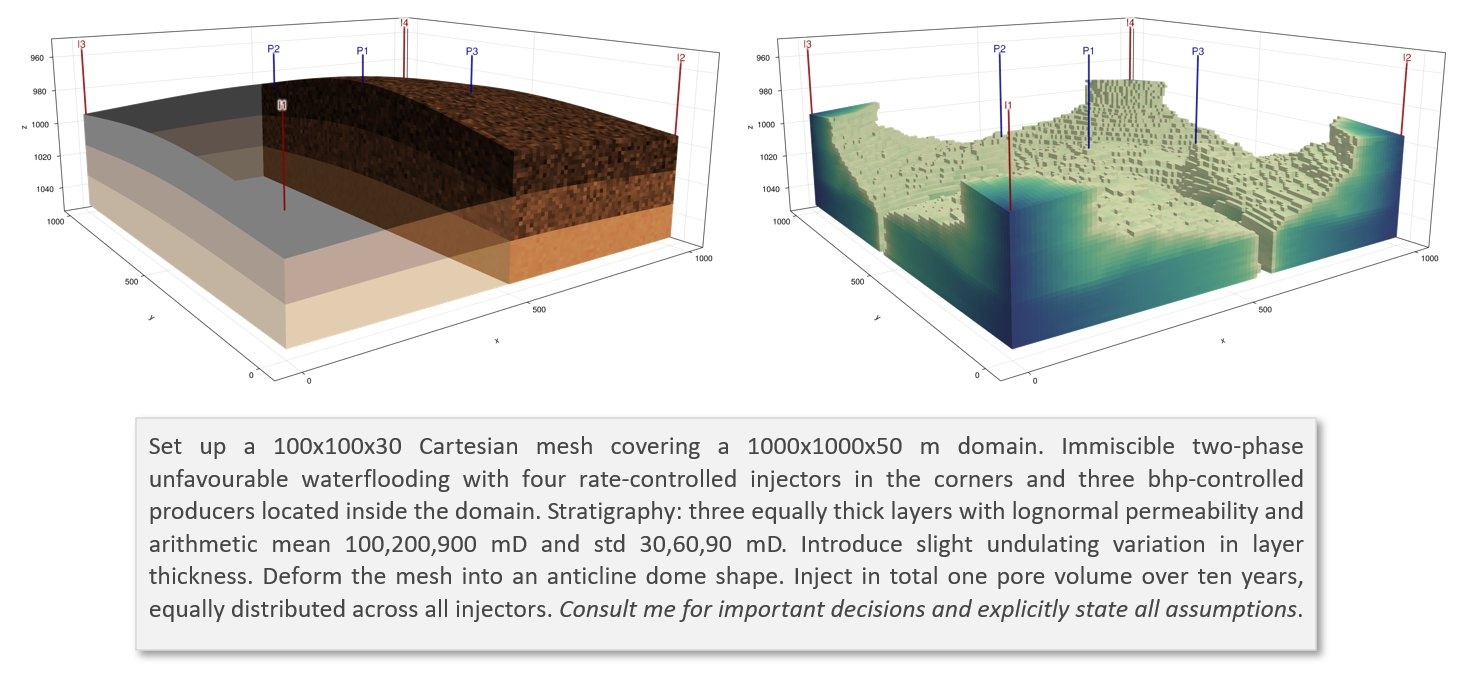Figure 9. Waterflooding scenario created by JutulGPT from a natural-language prompt. The prompt is shown below the results. The left panel shows the model geometry and heterogeneity; the right panel shows how water has spread through the reservoir after the injected water has reached the producers.