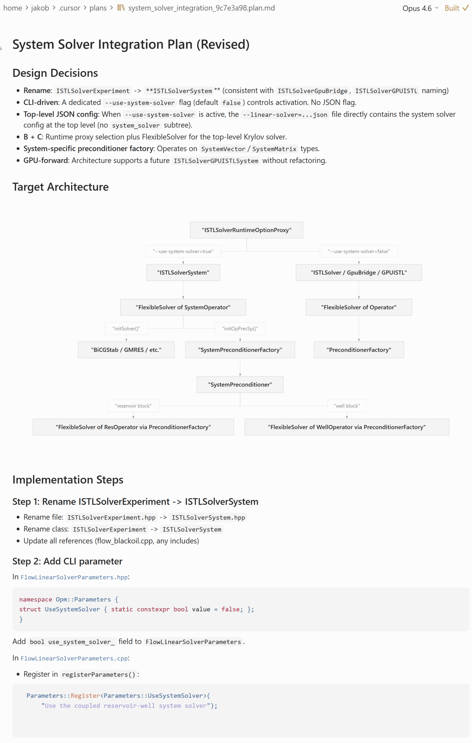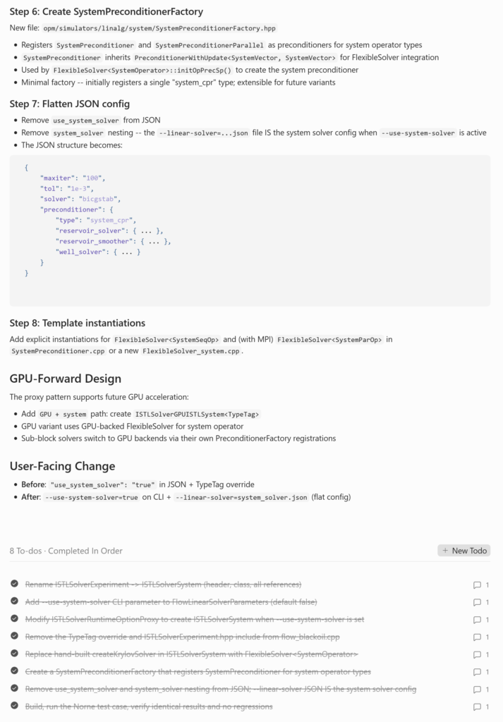 Figure 2. The agent’s workspace during planning and implementation of the OPM Flow refactoring task. On the left is the proposed integration plan and target architecture; on the right are later implementation steps, design notes, and the completed task list. The figure shows that the agent is not just generating code, but working through a structured sequence of planning, execution, and verification.