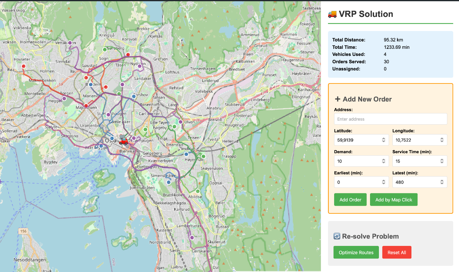 Figure 3. A simple route-planning demo built in a day. The interface shows computed vehicle routes in the Oslo region, with 30 orders served by 4 vehicles. Orders can be added interactively and the solution re-optimized on demand.