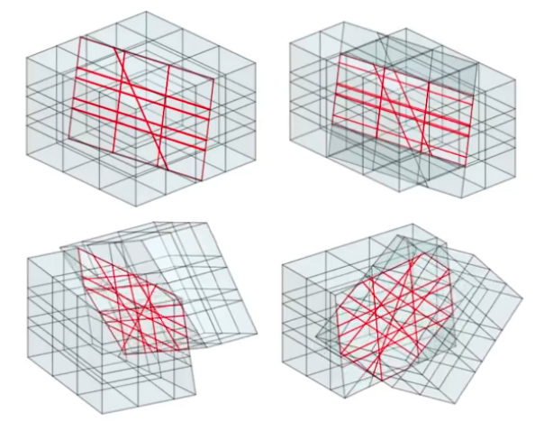 Figure 4. Two examples from the computational geometry work. Left: a corner-point grid with fault blocks and multiple stratigraphic layers, generated from subsurface grid formats. Right: non-conformal mesh gluing, in which a rectangular grid is cut in two and the two halves are displaced and rotated relative to each other along a cut plane. The red lines show the polyhedral intersection geometry that must be computed correctly for the coupling to be valid.