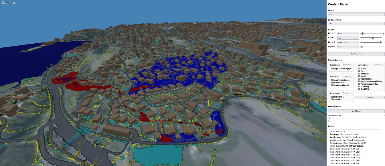 In this case, the immediate context was the SUrbArea project, which aims to reduce societal risk in a changing climate through nature-based solutions in sustainable urban development. The project needed an interface that would allow partner municipalities to work directly with the SWIM software. The graphical user interface (GUI) built with the agent, shown in Figure 5, adds a full 3D interactive interface with terrain visualization, configurable surface layers, object layers for buildings and roads, drainage network display, and simulation controls.