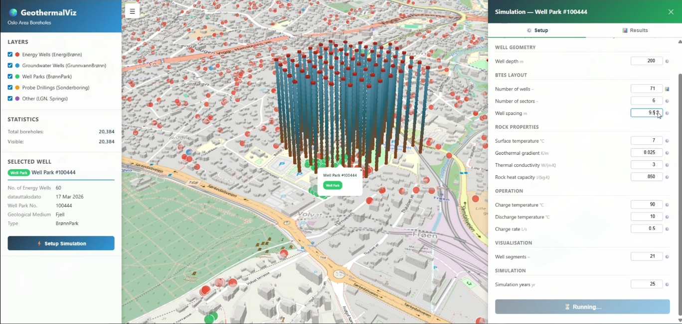 Figure 6. An interactive tool for geothermal simulation that combines open borehole data from NGU with the Fimbul geothermal simulator. Users can explore existing boreholes, design new configurations, and set up simulations through a graphical interface.