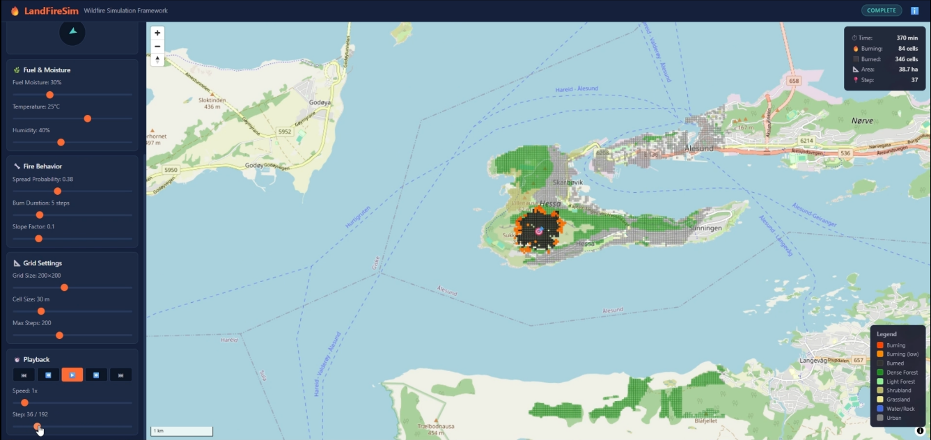 Figure 7. A wildfire simulation tool built in Julia in roughly a day using openly available datasets. The tool can set up simulations for locations worldwide and is shown here for the Sukkertoppen area in Ålesund, where a real wildfire broke out on 16 March 2025. Orange cells are actively burning, black cells have burned, and green cells indicate forest cover.