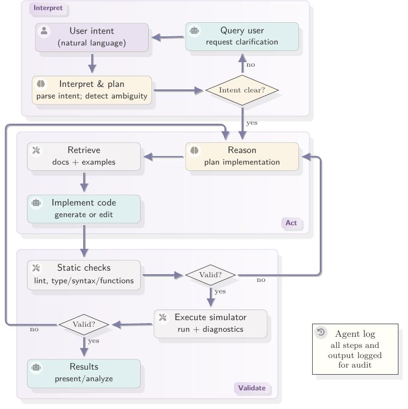 One practical lesson emerged clearly from the early experiments: iteration is essential. An initial one-shot approach, generating the full simulation script from a single query, produced poor results. The agent would either retrieve an existing example unmodified or hallucinate non-working code. Adding a linting step before execution, and allowing the agent to iterate on errors, dramatically improved quality. This is the kind of verify-and-repair loop that is now built into modern agentic coding tools. We developed much of the same machinery ourselves, but at the time with considerably more manual effort. The field has since converged independently on these mechanisms, which is some confirmation that the approach was sound.