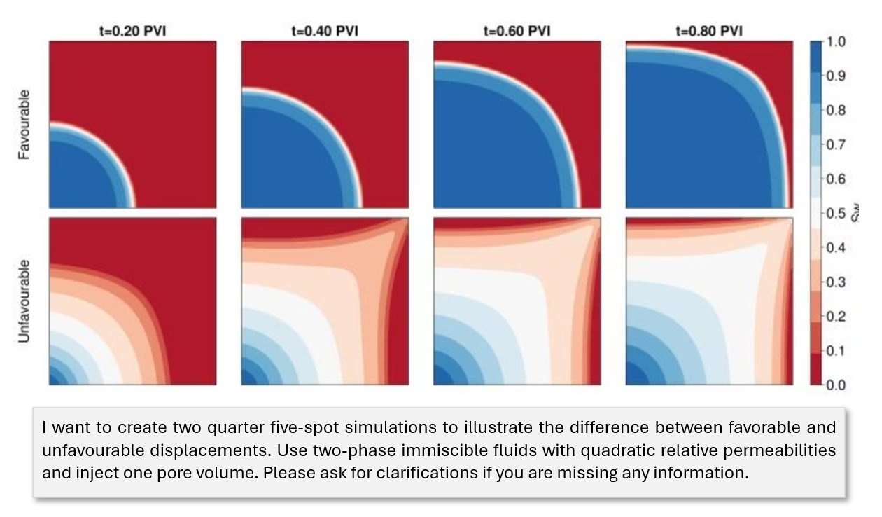 A central question in improved hydrocarbon recovery is how efficiently an injected fluid sweeps through the porous rock and displaces the hydrocarbons one wants to produce. Injection is typically used both to maintain reservoir pressure, which pushes fluids to the surface and would otherwise decline as fluids are produced, and to physically displace oil or gas toward the production wells. How well this displacement works (i.e., how much of the reservoir is contacted and swept by the injected fluid) directly determines how much can be recovered. The quarter five-spot is the canonical benchmark for studying displacement efficiency: a single injector and a single producer placed at opposite corners of a square domain, designed to isolate this effect in a controlled, symmetric setting.
