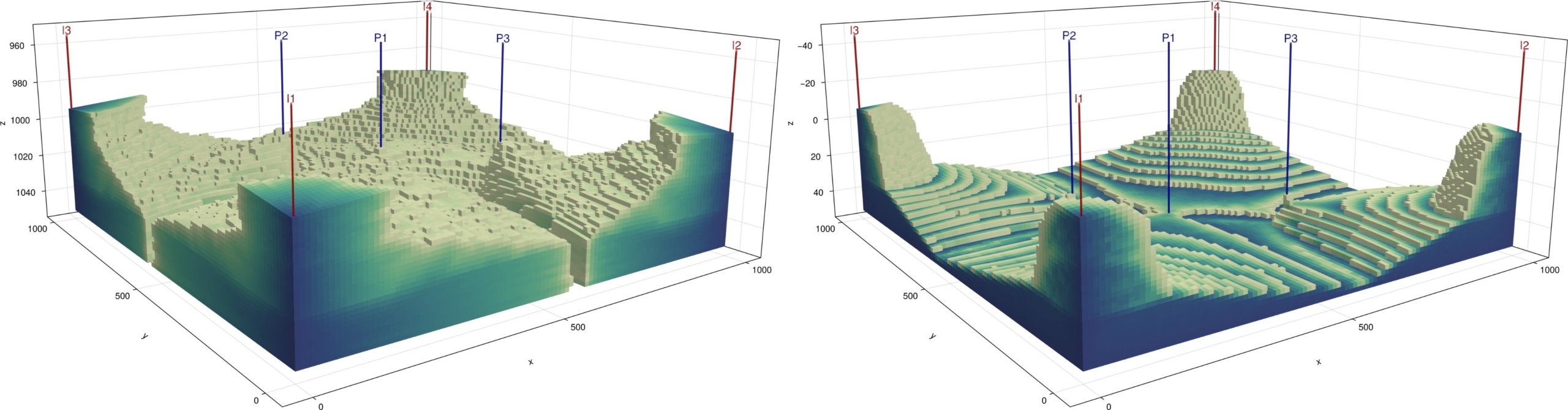 Figure 5. The heterogeneous anticline model rendered with permeability coloring. Left: the compressible reference model. Right: the incompressible reconstruction from the technical report. The difference in fluid compressibility, never explicitly specified and therefore absent from all three textual representations — produces qualitatively different flow behavior.