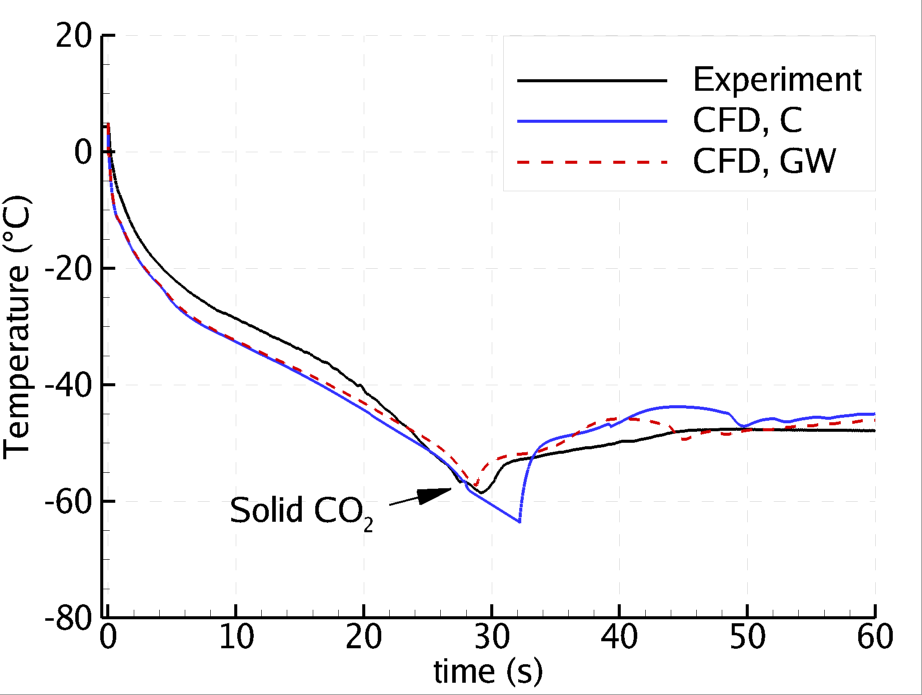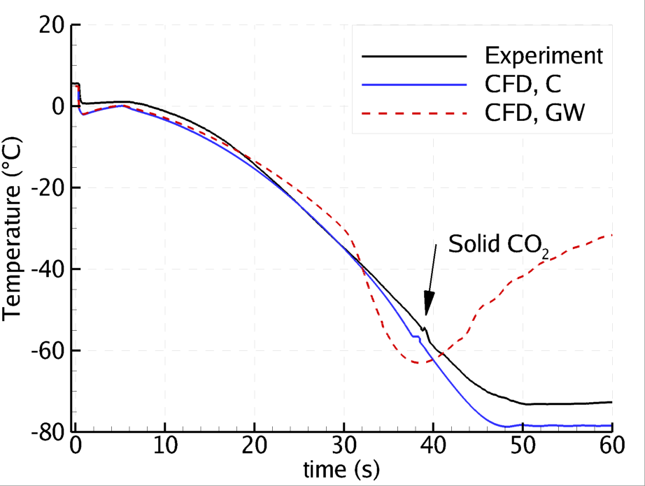In the article, we could not resist performing some calculations ourselves. We studied one of the pipe-depressurization experiments performed by DNV GL. In these experiments, a straight pipe was filled with CO2. At a certain time, one end was opened to the atmosphere, and pressure and temperature were recorded at various positions inside the pipe. This can be seen in Figures 1 and 2, where we have plotted experimental data along with calculations from our 1D two- and three-phase CFD model. The black line represents the experimental data. The blue line and the red dashed line represent our CFD calculations, with the only difference being the in-tube heat-transfer correlation. (‘C’ denotes Colburn and ‘GW’ denotes Gungor–Winterton). Close to the outlet (Figure 1) one can see that the use of the Gungor–Winterton correlation gives the best result. In particular, the minimum point is quite well captured. This is the point where there is no solid or liquid CO2 left, and the flow is gas-only.