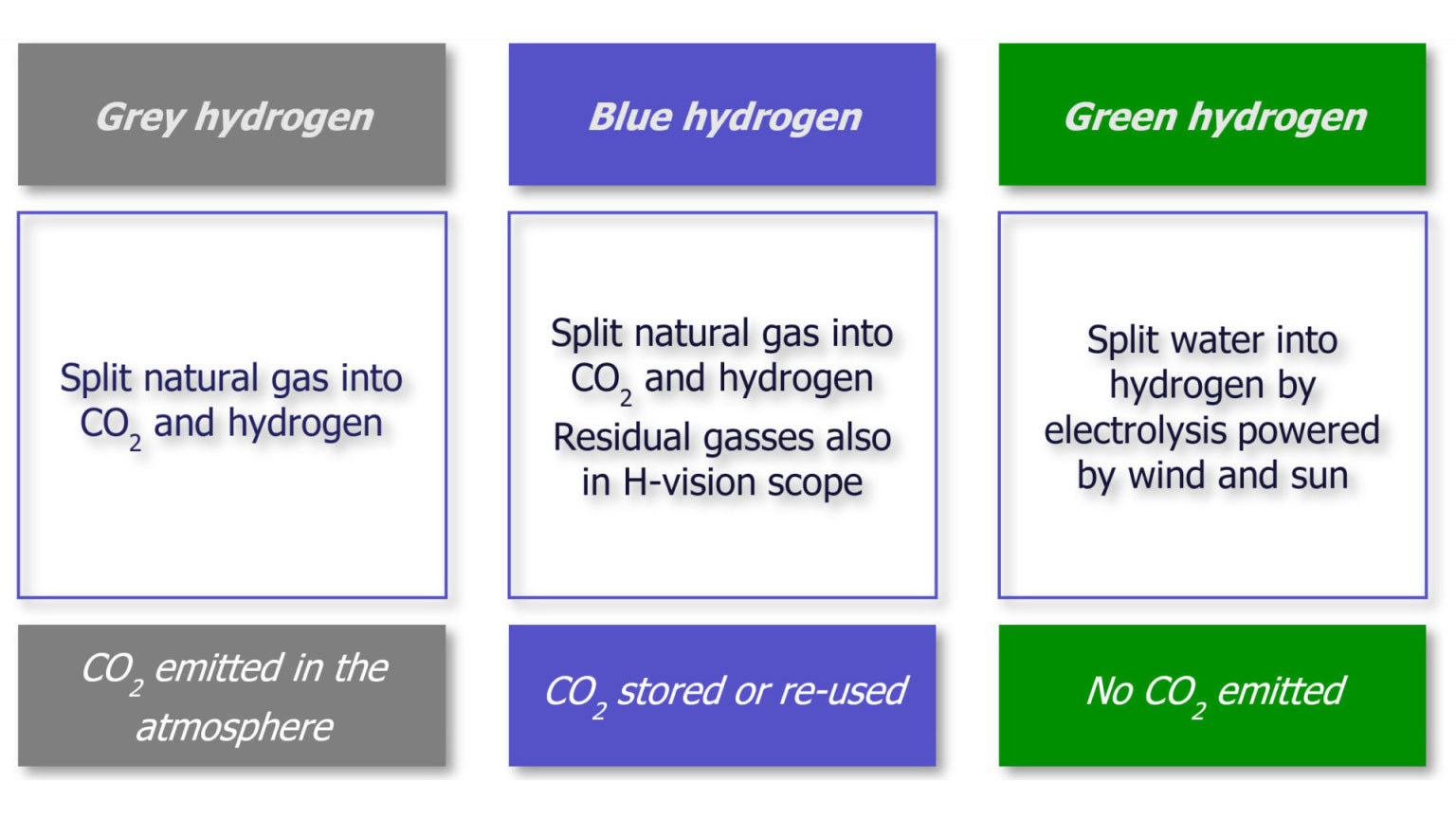 Blue hydrogen is produced from natural gas or industrial residual gasses, using mature technology that can be deployed on the short term. Most of the CO2 will be captured and safely stored in depleted gas fields in the North Sea, but can partly be also used for local greenhouses and potentially as a chemical building block. Blue hydrogen can pave the way towards the “green hydrogen economy” by the infrastructure created that will also enable the transport and storage of green hydrogen.