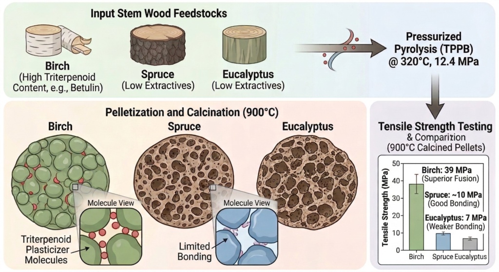 During the pelletization and calcination phases, these triterpenoid compounds acted as powerful natural plasticizing agents. They effectively lowered the glass transition temperature of the biochar, transforming the powder into a “rubbery phase” at lower temperatures. This allowed the microscopic particles to fuse together seamlessly, generating incredibly strong interparticle bonds without the need for any artificial, external chemical binders.