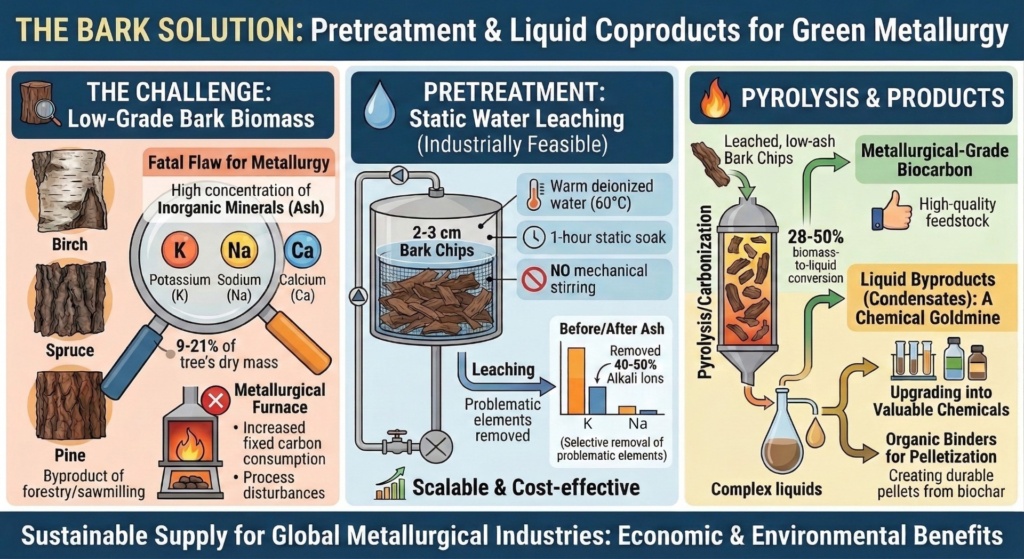 Bark is a prime candidate. It makes up 9 to 21% of a tree’s dry mass and is generated in large amounts as a byproduct of the forestry and sawmilling sectors. However, bark comes with a fatal flaw for metallurgy: it is packed with high concentrations of inorganic minerals (ash), particularly alkaline and alkaline earth metals (AAEMs) like potassium, sodium, and calcium. If introduced into a metallurgical furnace, these impurities can lead to increased fixed carbon consumption, disturb the metallurgical process and influence on the final metal product.