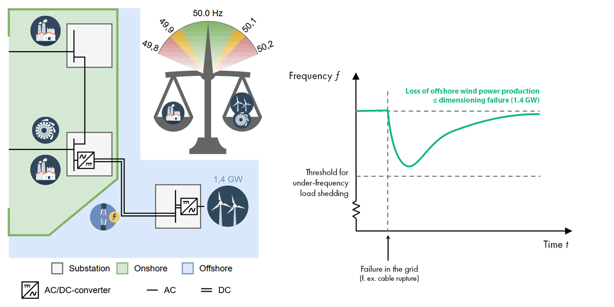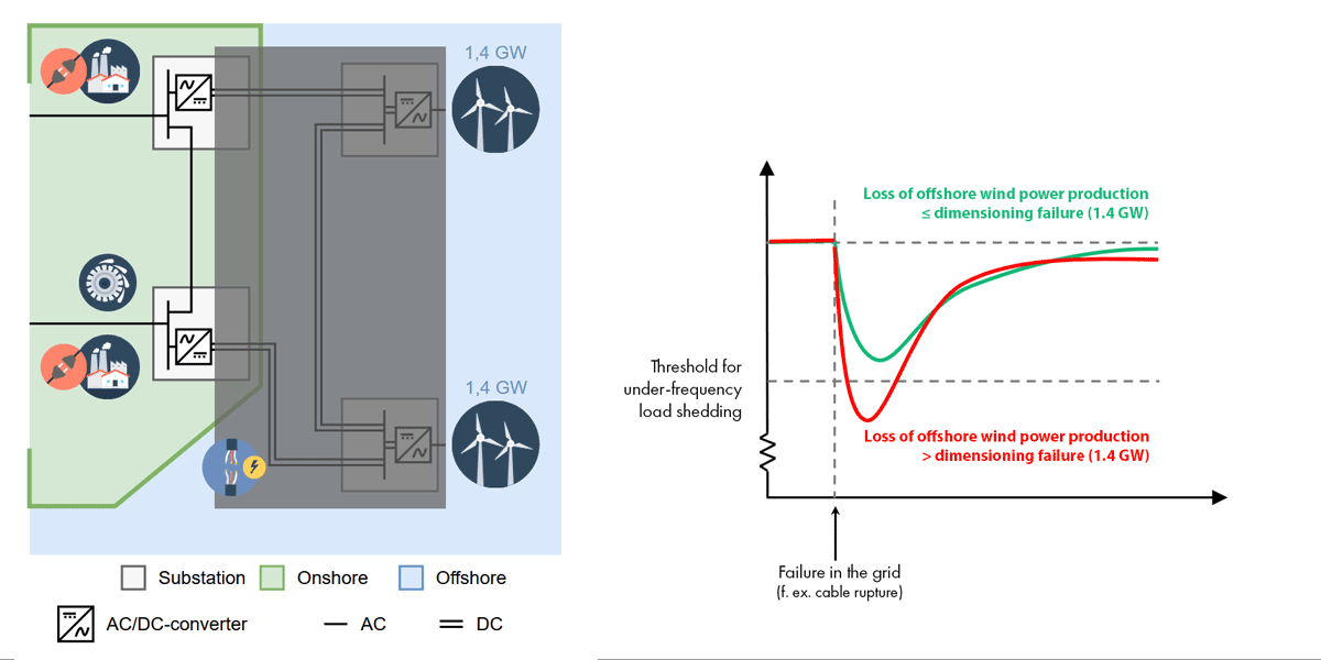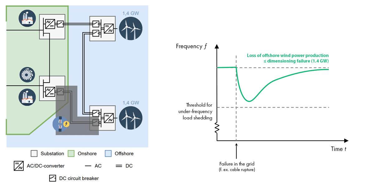 The left part of Figure 3 illustrates a possible interconnected offshore and onshore grid, where two offshore wind farms are linked by an HVDC cable that can both relieve the onshore grid and direct offshore wind power to land. A grid that gives electricity multiple paths it can travel through is called a meshed grid. In meshed onshore HVAC grids, protection systems detect faults and open circuit breakers, which isolates faults and maintains transmission in the unaffected parts of the grid. However, a fault anywhere in the HVDC grid depicted in Figure 3 necessitate the disconnection of the entire offshore grid, and of all wind power production. This poses a significant risk: the frequency can drop to such a level that consumers need to be disconnected to prevent a frequency collapse. This illustrates that such offshore and onshore grids, when coupled together, are vulnerable to faults occurring offshore.