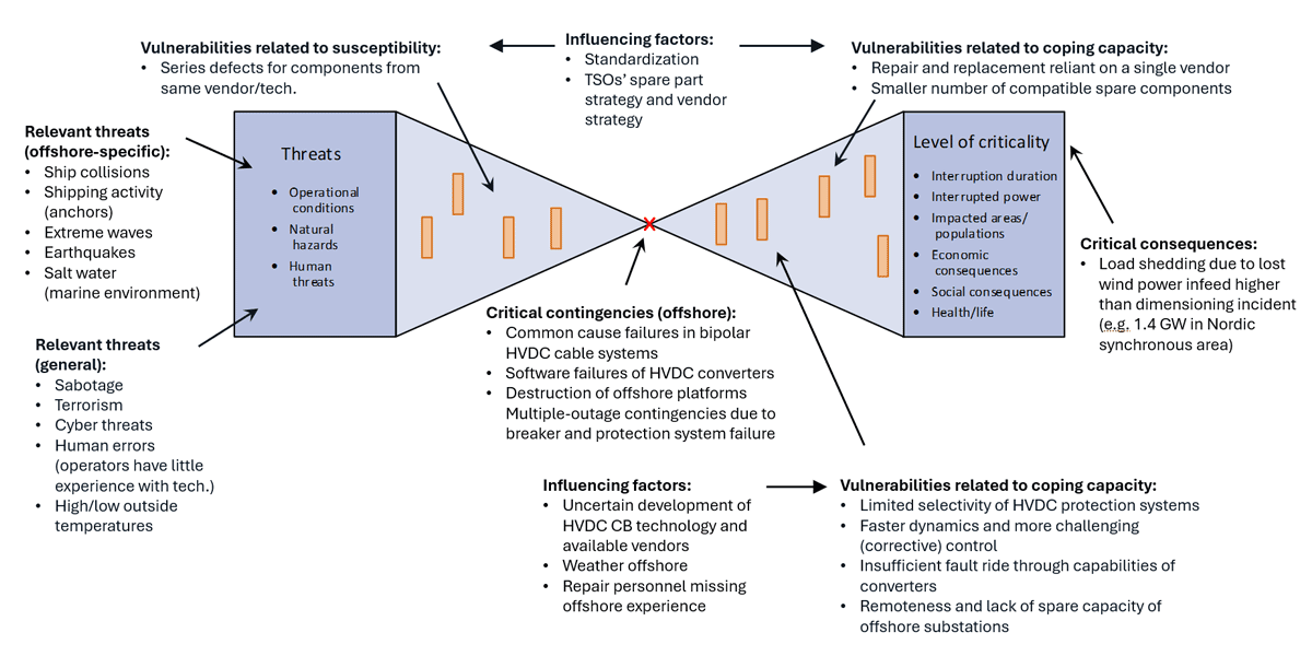 In earlier research projects, SINTEF has developed frameworks and methodologies for vulnerability analysis in power systems, based on this conceptual model. This blog article summarises how this methodology has been used to evaluate potential vulnerabilities in future interconnected offshore and onshore grids. The work was conducted collaboratively between two research projects led by SINTEF Energy Research: 1) “Development of coupled offshore and onshore grids”, a collaborative and knowledge-building project partially funded by the Research Council of Norway, with NTNU, Statnett, Aker Solutions and GE Vernova as partners; and 2) “MISSION”, an EU-funded project developing switchgear technology not reliant on the climate-damaging gas SF₆. The analysis was based on in-depth interviews with eight partners from both projects, including transmission system operators (TSOs) and other stakeholders. The findings were presented at the international CIGRE symposium in Trondheim, in May.