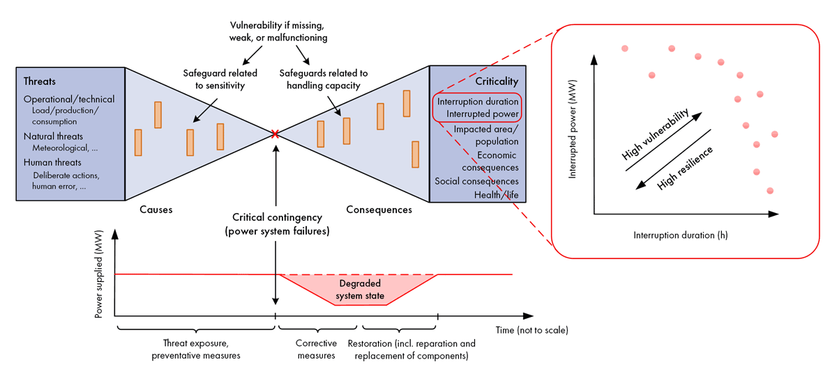 A power system might consistently maintain high security of supply over many years, yet still be vulnerable to exceptional events causing extensive or prolonged outages. A vulnerability can be understood as an inadequate protective barrier against such critical consequences. This concept is illustrated in Figure 1 below, showing a version of the “bow-tie model” often used in risk assessment.