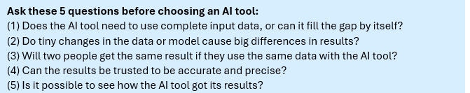 However, data with bad quality is just one aspect. Choosing the right AI tool is another. AI is a box with many tools. Some are good for collecting or processing data, and others are good for environmental impact calculations. Without being an expert in AI, it is very difficult to know which AI tool to use for what. We looked at eleven AI tools and listed which tool is used for what step in environmental assessment. We also checked them against the five AI questions. None of the AI tools perfectly answered the given questions. Some phases have multiple potential AI tools, but you must look at how they score against the five AI questions and then select the best. You don’t take that decision alone. It is best to involve people who know about: AI and data management, environmental assessment, and the manufacturing process for the product. This means people select the AI tool.